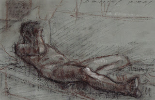 “Reclining Male Nude” 6″ x 9″ Charcoal on drawing paper,