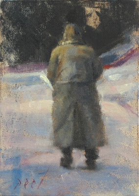 "Unbound" 5×7 Male figure seen from behind Urban landscape painting