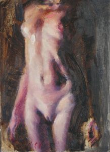 Alla prima of a frontal female nude torso. 5×7′ oil on Ampersand panel